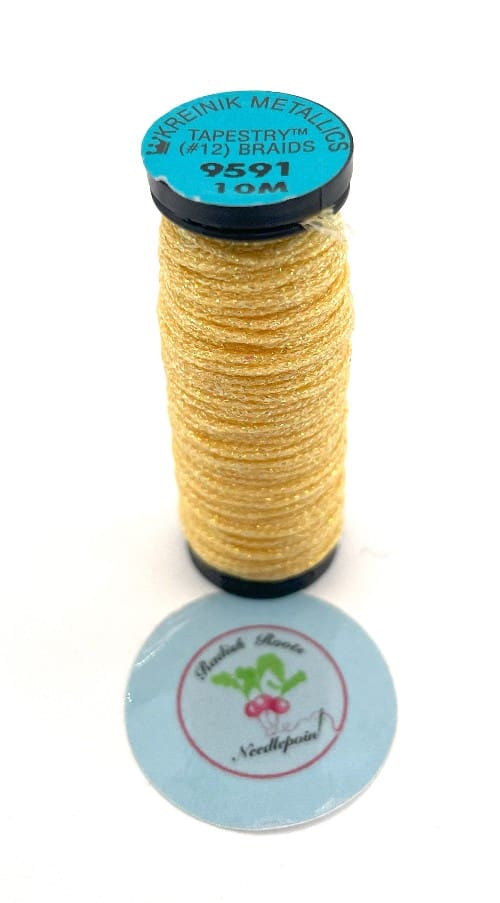 Tapestry #12 Braid is thinner than #16 Braid and thicker than #8 Braid. It comes in basic metallic colors plus holographic (L), antique (V), glow in the dark (F), high lustre (HL), and corded (C) colors.