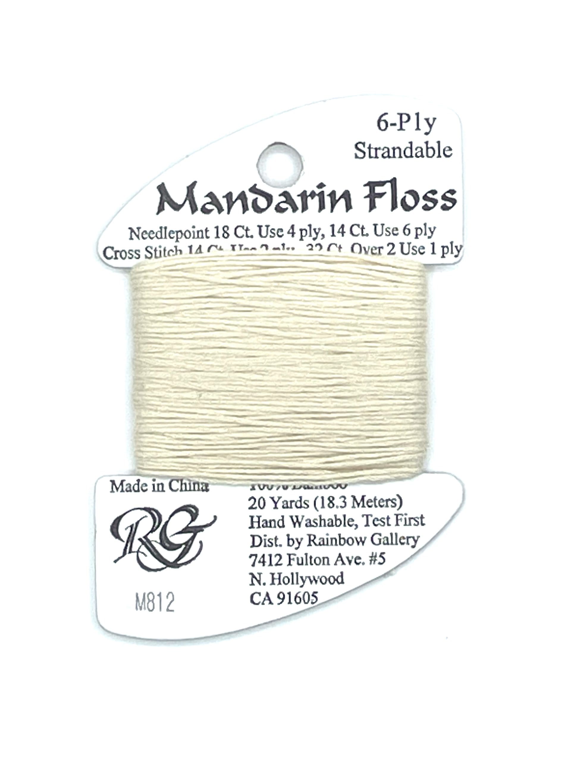 A beautiful and easy to use 100% bamboo 6 strand floss.  Use wherever you would a cotton floss, strand for strand. Ply up or down to suit your needs. It lays better than cotton because it is softer and yet is still quite strong. You can use slightly longer stitching lengths since it wears better too.  It is less costly than silk but has many silk-like properties. Its semi-matte finish doesn't overpower your other stitches.  Most matte threads lines have gone off the market and Mandarin floss works well as a substitute. Blends well with metallic filament for cross stitching.  Great for French Knots, Turkey Work, tassels and twisted cords.