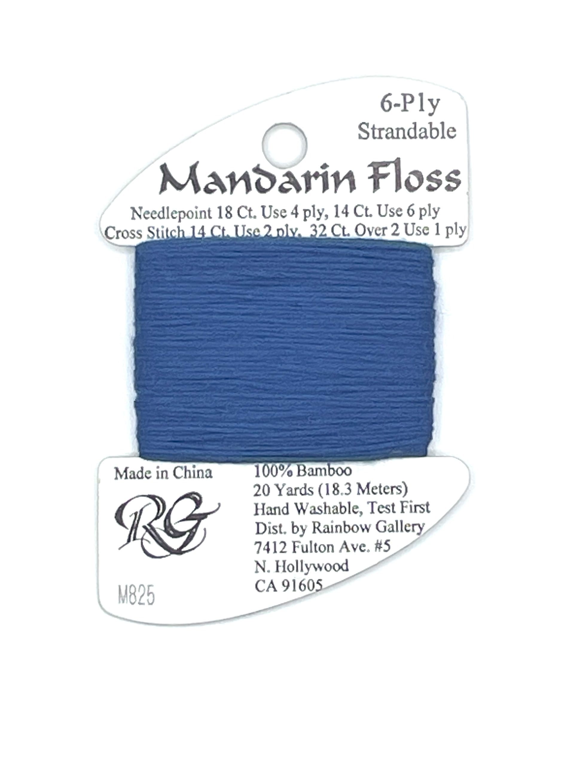 A beautiful and easy to use 100% bamboo 6 strand floss.  Use wherever you would a cotton floss, strand for strand. Ply up or down to suit your needs. It lays better than cotton because it is softer and yet is still quite strong. You can use slightly longer stitching lengths since it wears better too.  It is less costly than silk but has many silk-like properties. Its semi-matte finish doesn't overpower your other stitches.  Most matte threads lines have gone off the market and Mandarin floss works well as a substitute. Blends well with metallic filament for cross stitching.  Great for French Knots, Turkey Work, tassels and twisted cords.