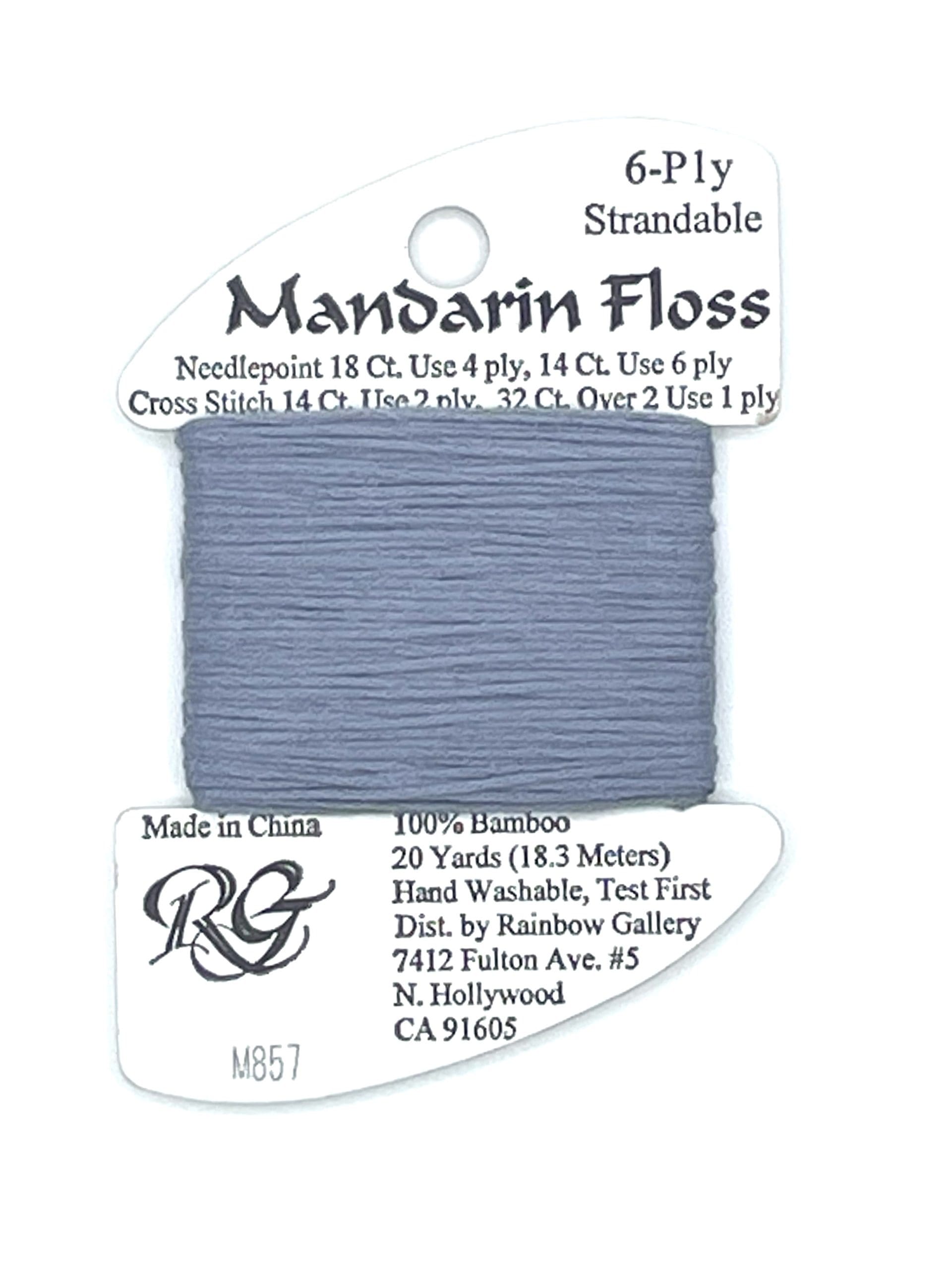A beautiful and easy to use 100% bamboo 6 strand floss.  Use wherever you would a cotton floss, strand for strand. Ply up or down to suit your needs. It lays better than cotton because it is softer and yet is still quite strong. You can use slightly longer stitching lengths since it wears better too.  It is less costly than silk but has many silk-like properties. Its semi-matte finish doesn't overpower your other stitches.  Most matte threads lines have gone off the market and Mandarin floss works well as a substitute. Blends well with metallic filament for cross stitching.  Great for French Knots, Turkey Work, tassels and twisted cords.