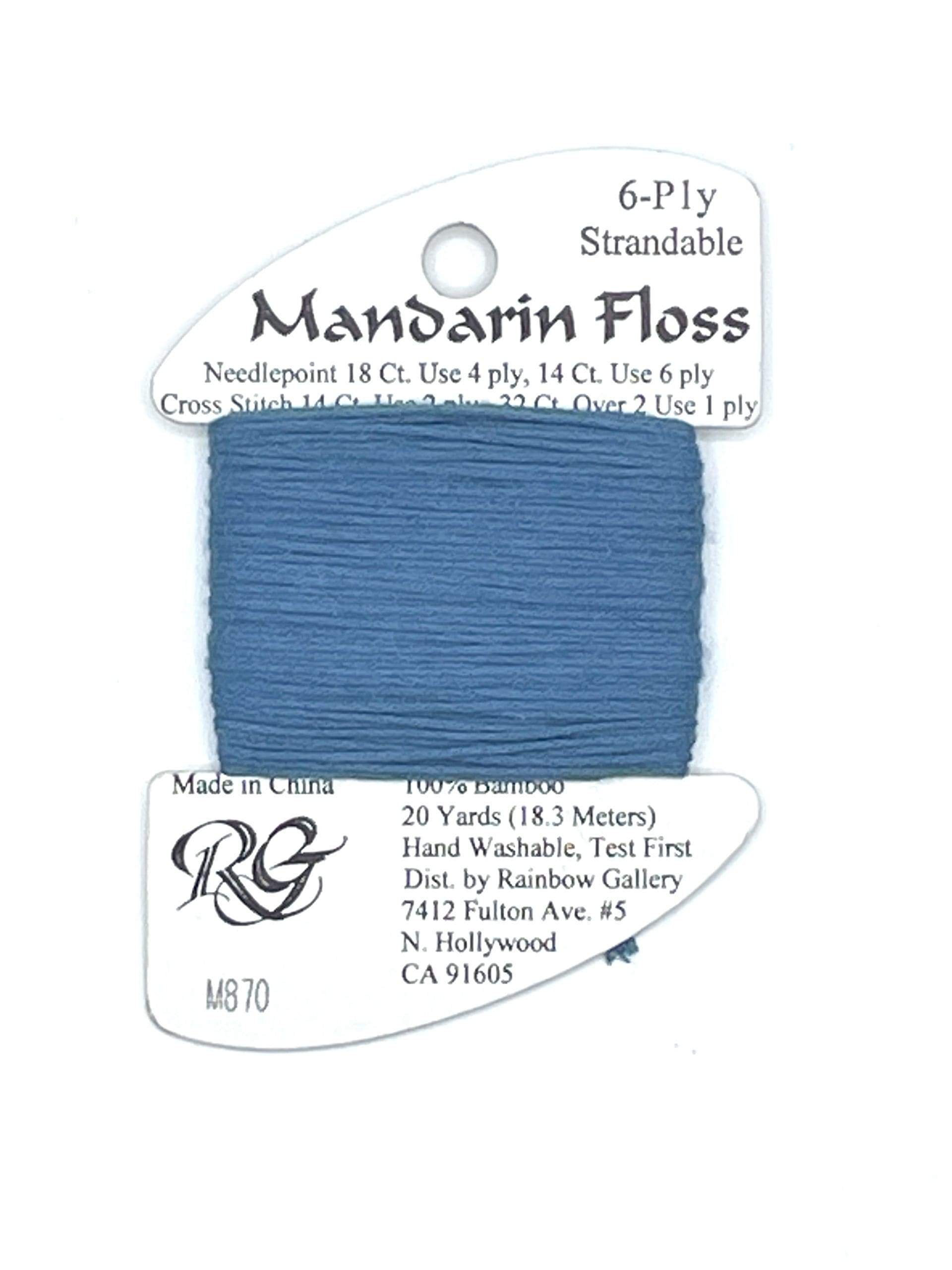 A beautiful and easy to use 100% bamboo 6 strand floss.  Use wherever you would a cotton floss, strand for strand. Ply up or down to suit your needs. It lays better than cotton because it is softer and yet is still quite strong. You can use slightly longer stitching lengths since it wears better too.  It is less costly than silk but has many silk-like properties. Its semi-matte finish doesn't overpower your other stitches.  Most matte threads lines have gone off the market and Mandarin floss works well as a substitute. Blends well with metallic filament for cross stitching.  Great for French Knots, Turkey Work, tassels and twisted cords.