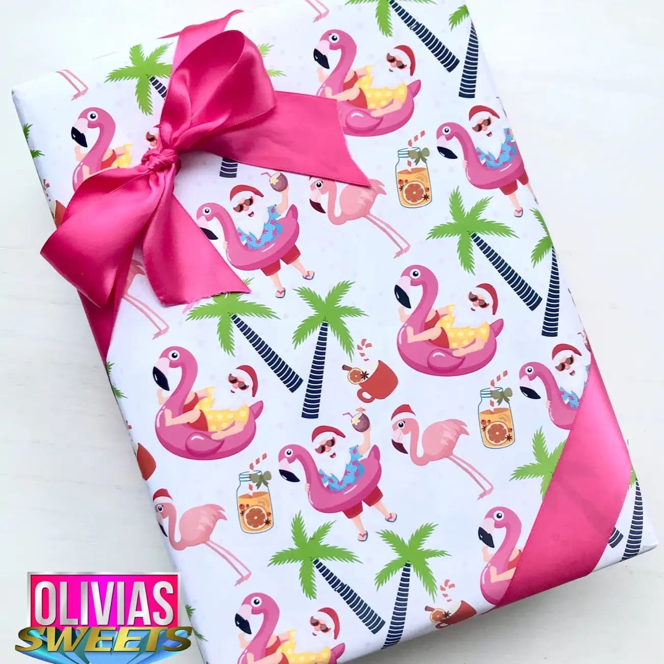 This super cute tropical flamingo Christmas wrap is a fun addition to any Christmas style! Featuring Santa with flamingos and flamingo pool toys, and of course, holiday cocktails. Can’t forget the cocktails.